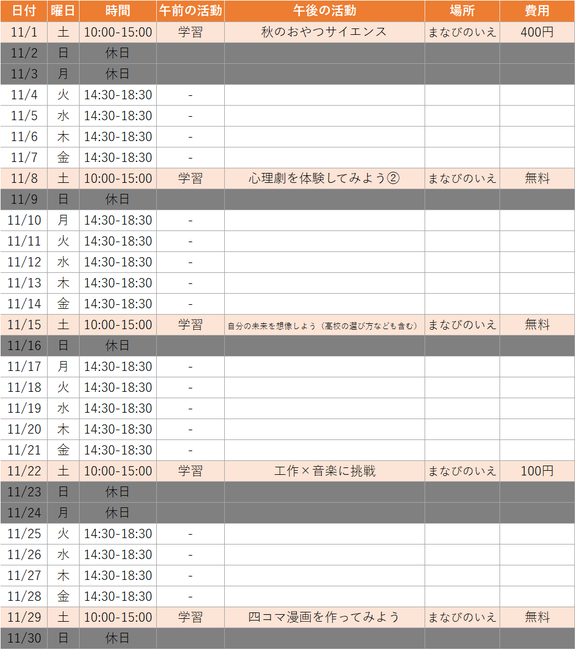 ※学校休業日は、10:00~12:00に学習、13:00~15:00に上記活動を実施いたします。(昼食のご用意をお願いいたします)