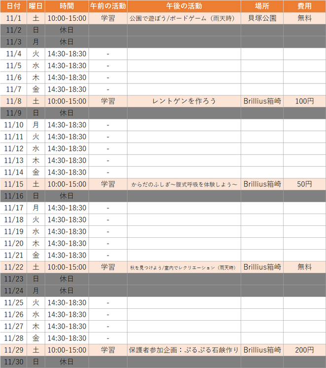 ※学校休業日は、10:00~12:00に学習、13:00~15:00に上記活動を実施いたします。(昼食のご用意をお願いいたします)